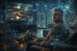 Το κύμα του πανικού που αναδυόταν μέσα στο μυαλό μου άρχισε να εξαπλώνεται εκθετικά. Σήκωσα ενστικτωδώς το γλυπτό που είχα πετάξει στο πάτωμα και το έβαλα πίσω στη συνηθισμένη του θέση, σ’ ένα διάφανο τραπέζι που στεκόταν δίπλα σε μια πανάκριβη παιχνιδομηχανή εικονικής πραγματικότητας. Μια ανόητη προσπάθεια αποκατάστασης της τάξης υποθέτω.